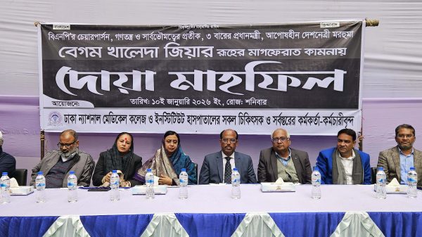 ডা. খান ইফতেখার, স্বাস্থ্য ডেস্ক বাংলাদেশের সাবেক প্রধানমন্ত্রী, বিএনপি চেয়ারপারসন ও আপসহীন নেত্রী বেগম খালেদা জিয়া এর ইন্তেকালে তাঁর রুহের মাগফেরাত ও চিরশান্তি কামনায় সম্প্রতি ঢাকা ন্যাশনাল মেডিকেল কলেজ ও ইনস্টিটিউট হাসপাতালের ডক্টরস অ্যাসোসিয়েশন অব বাংলাদেশ (ড্যাব) একটি দোয়া মাহফিলের